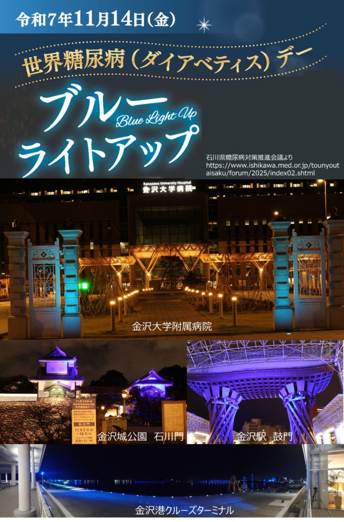 県内各所では世界糖尿病デーに合わせたブルーライトアップが行われ、金沢大学附属病院の正面も青色に染まりました。